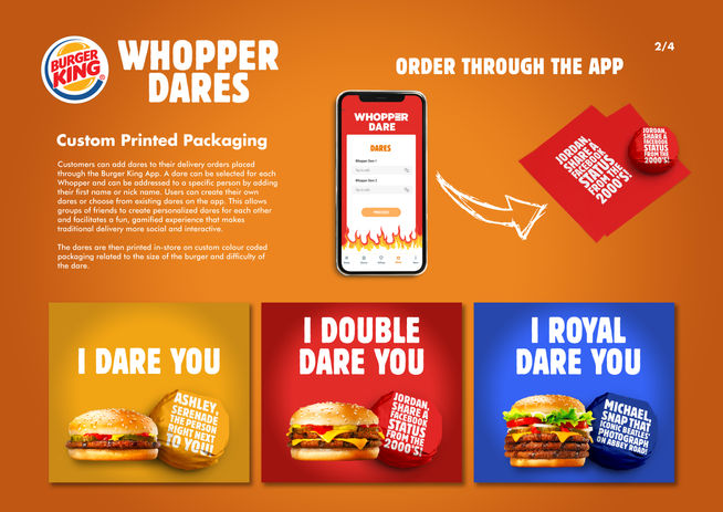 Young people today spend more time watching others experience life online, than actually living it themselves. We looked at 18 to 24-year old’s around the world and found that 70% watch around 3 hours of mobile video per day. Burger King wants its customers to get busy living, by putting the fun back into delivery and making every experience social, customisable and interactive. To solve this, we created the Whopper Dares campaign. A campaign that dares young people to get away from their screens and join in the fun, by printing custom dares on the iconic whopper and creating a user-driven activation.